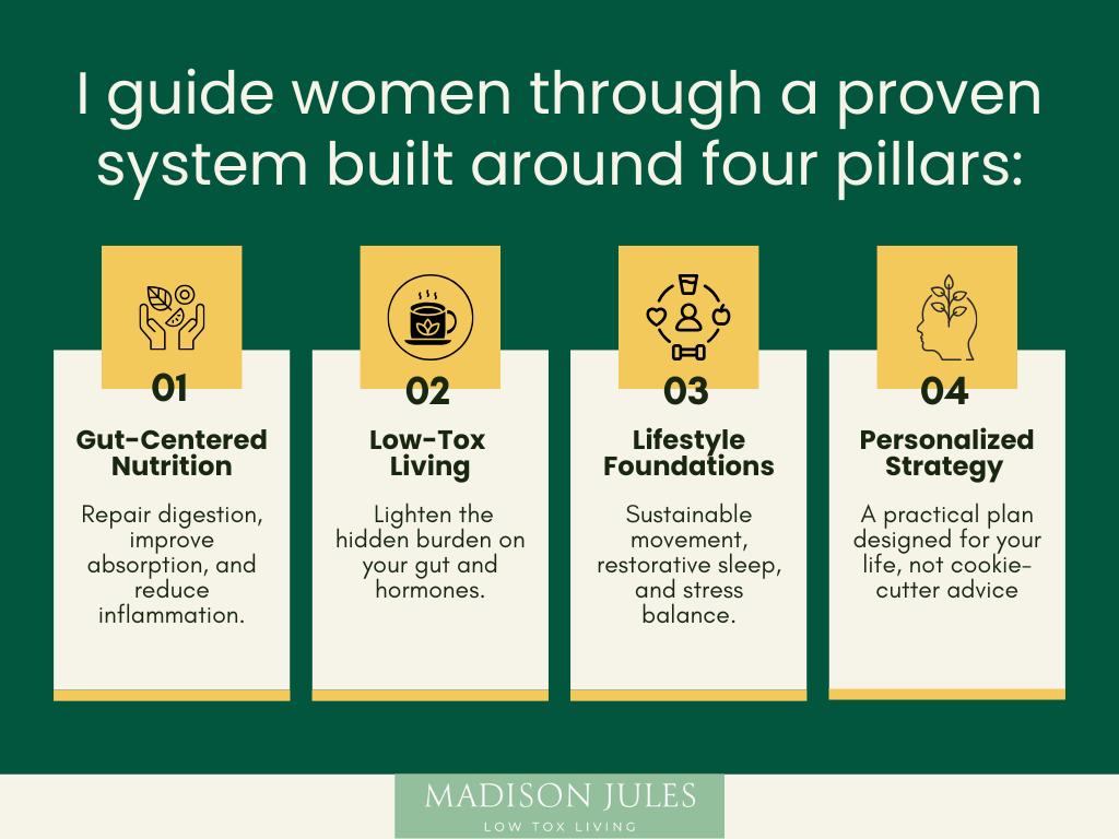 I’m Madison Jules. I help women restore gut and overall health with a root cause approach so they can regain energy, clarity, and balance without extreme diets, endless supplements, or quick fixes.